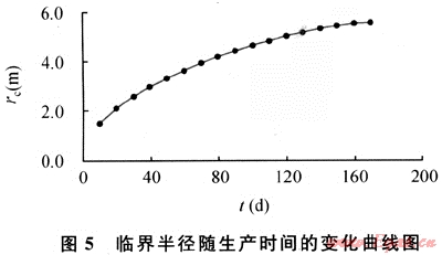 計(jì)算的臨界半徑隨時(shí)間推移曲線如圖5。表明生產(chǎn)時(shí)間越長(zhǎng)臨界半徑越大,水相蒸發(fā)的影響范圍越深,但是當(dāng)生產(chǎn)時(shí)間超過一定值后(120d),臨界半徑趨于定值,水相蒸發(fā)作用逐漸變緩。