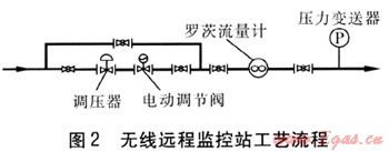 無線遠(yuǎn)程監(jiān)控站是在原有的區(qū)域中-低壓調(diào)壓站的基礎(chǔ)上,通過工藝改造增設(shè)羅茨流量計、壓力變送器、電動調(diào)節(jié)閥、無線數(shù)據(jù)采集器(RTU)、后備電源以及無線數(shù)傳Modem構(gòu)成。無線遠(yuǎn)程監(jiān)控站工藝流程見圖2。無線數(shù)據(jù)采集器是一種具有采集、處理功能的自動化設(shè)備,專門針對低功耗、無人值守站而設(shè)計,與流量計、壓力傳感器、電動閥門上的數(shù)據(jù)通信接口相連接,按內(nèi)置程序采集數(shù)據(jù)后,執(zhí)行操作指令上傳數(shù)據(jù),由無線數(shù)傳Modem接收信號并解碼壓縮后將信號傳回監(jiān)控中心的工控機(jī)。在后備電源的支持下,能夠保證系統(tǒng)在斷電的情況下正常運(yùn)行48h。