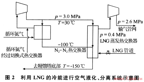 常用的空氣分離法是將空氣液化,通過氟利昂冷凍機、透平膨脹機進行空氣的液化和分離,制成液態(tài)的氮氣、氧氣、氬氣等。而LNG冷熱能用于空氣分離則是通過循環(huán)氮氣的冷卻來實現(xiàn)(見圖2)。一般來說,生產(chǎn)10×104m3的液態(tài)氣體大約需要650×104kJ的冷卻能。利用LNG的冷熱能,循環(huán)氮氣壓縮機可小型化;因不需要冷凍機,建設(shè)費用也可相應減少;此外,LNG作為空氣分離裝置的預冷劑,生產(chǎn)液氬的空分裝置中,利用其冷能冷卻和液化由下塔抽出經(jīng)過復熱的循環(huán)氮,可以省去氟利昂制冷機以及氮透平膨脹機組,使產(chǎn)品能耗平均降低0.5kwh/m3,裝置的投資費用可減少10%左右,生產(chǎn)成本降低20%~30%。