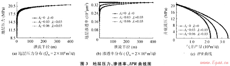 如圖3-a所示,在氣體采出過程中,地層中存在壓降漏斗;氣井以2×104m3/d生產(chǎn)時,應力敏感常數(shù)Ak和啟動壓力梯度λ越大,地層中壓力下降越多;且要達到相同的產(chǎn)量,應力敏感和啟動壓力梯度影響的氣井,要以更低的井底流壓,更大的生產(chǎn)壓差生產(chǎn)。