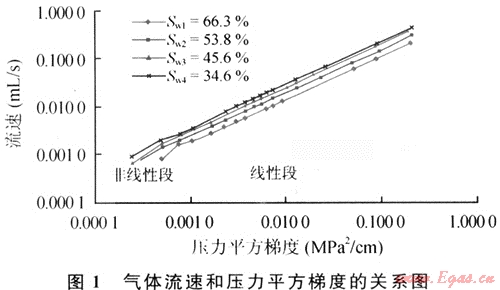 致密低滲透氣藏普遍具有低孔、低滲、束縛水飽和度高的特點,由于細小孔隙喉道處水化膜的封堵作用,氣體滲流往往具有啟動壓力梯度特征,作用于氣體兩端的壓力梯度要大于啟動壓力梯度才能流動[1];同時許多致密低滲透氣藏具有“應力敏感”特征[2]。致密低滲透儲層巖心氣體低速滲流實驗結果如圖1,在氣體流速和壓力平方梯度的關系圖上,線性段為達西滲流段,非線性段不通過坐標原點,和x軸的交點即為啟動壓力梯度,儲層含水飽和度越高,啟動壓力梯度作用才明顯。致密低滲透氣藏儲層滲透率隨有效應力的變化如圖2。可以看出在降內(nèi)壓過程中,滲透率隨有效應力的增大而減小,在儲層壓力恢復的過程,由于儲層發(fā)生了部分塑性變形,滲透率并不能恢復到初值。