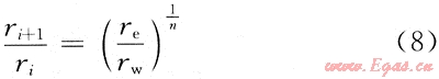 對于穩(wěn)態(tài)滲流的氣井,在離井較遠的地方,壓力變化比較緩慢;而在井的附近,壓力下降卻非??臁T谟脭?shù)值方法求解氣井產(chǎn)量時,采用非均勻網(wǎng)格,即數(shù)值模擬柱坐標系統(tǒng)中常用的沿徑向節(jié)點坐標分布公式: