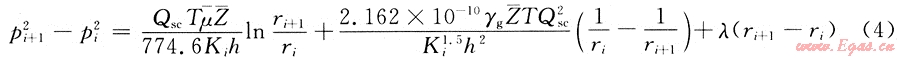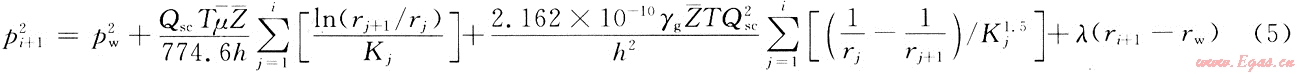 將i=3,4,…,n分別帶入式(5)中,可以得到n-2個類似的方程,并將這n-2個方程和式(3)和式(4)一起疊加,便可以得到考慮儲層變形和啟動壓力梯度、非達西流動的氣井產(chǎn)能方程: