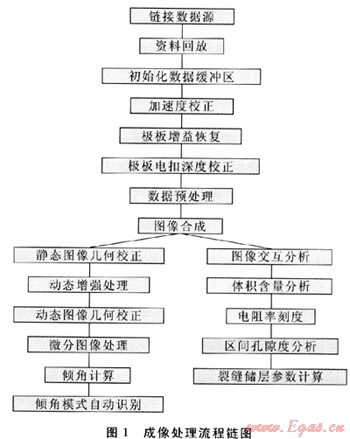 GeoReveal成像處理軟件在開發(fā)的過程中,針對國內(nèi)主流成像測井儀的設(shè)計原理、儀器結(jié)構(gòu)及測井方式,完成了成像資料預處理、圖像合成、圖像動態(tài)增強以及圖像繪制等一系列功能模塊。形成了一套功能強大、運行穩(wěn)定的成像測井資料解釋處理系統(tǒng)。系統(tǒng)采用鏈式管理結(jié)構(gòu)(圖1),提供給用戶方便、靈活的、交互性強的人機界面。