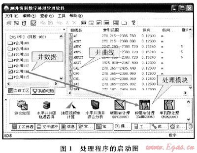 處理程序在設計時,應用了Windows系統(tǒng)的拖放功能實現(xiàn)對數(shù)據(jù)的調度,只要將井數(shù)據(jù)拖到相應處理模塊圖標上,則可應用該模塊進行處理(圖1)。