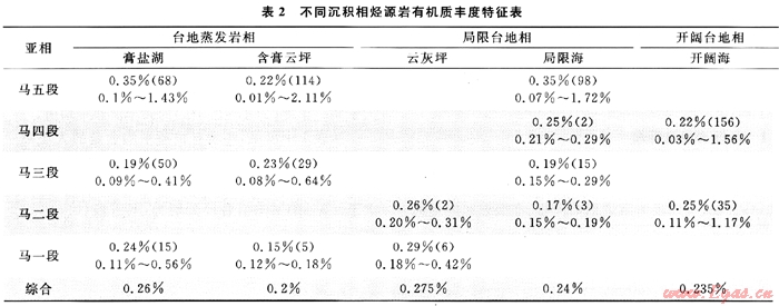 從中可見:馬五段膏鹽湖和局限海有機(jī)質(zhì)豐度最高,均為0.35%;而含膏云坪微相較低,僅為0.22%;在馬四段,沉積環(huán)境差異導(dǎo)致有機(jī)質(zhì)豐度不同的現(xiàn)象較明顯,局限海有機(jī)質(zhì)豐度明顯比開闊海高,兩者分別為0.25%和0.22%;馬三段盡管形成于水體相對封閉的環(huán)境,但是各微相有機(jī)質(zhì)豐度均很低;馬二段與馬四段類似,即局限臺地比開闊臺地有機(jī)質(zhì)豐度略高,云灰坪有機(jī)碳含量為0.26%,開闊海為0.25%;馬一段云灰坪和膏鹽湖有機(jī)碳含量較高,分別為0.29%和0.24%。