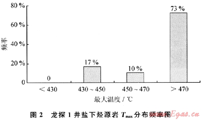 下奧陶統(tǒng)海相碳酸鹽巖缺乏陸源鏡質(zhì)組,故常用等效鏡質(zhì)組反射率(VRo)來確定其熱演化程度。研究區(qū)下古生界等效鏡質(zhì)體反射率全部大于1.8%,絕大部分大于2.0%,說明烴源巖全部熱演化至高過成熟階段,大部分演化至過成熟階段。此外,龍?zhí)?井83%的烴源巖樣品,其Tmax>450℃(圖2),