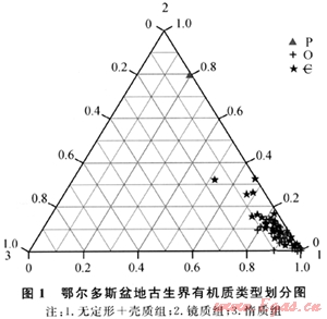 根據(jù)有機(jī)質(zhì)顯微組分特征可以確定有機(jī)質(zhì)的類型。這種方法確定的類型偏重于對有機(jī)質(zhì)來源的判斷。筆者將顯微組分劃分為3部分:無定形+殼質(zhì)組;鏡質(zhì)組;惰質(zhì)組。其中在寒武系和奧陶系無定形組分的含量均大于80%。以這3部分為端元,作出劃分有機(jī)質(zhì)類型的三角圖(圖1)。