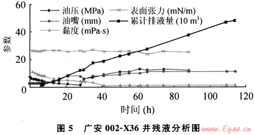 廣安002-X36井施工結(jié)束45min后開井排液。壓后自噴返排壓裂液173.7m3后出氣。至2007年9月27日,該井累計(jì)排液530m3,殘液的性能分析見圖5。