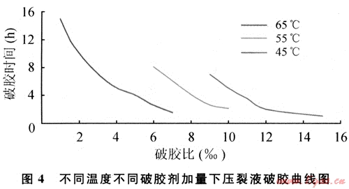 根據(jù)軟件模擬,考察了不同的破膠劑加量在不同溫度下的破膠情況(圖4)。施工過程中根據(jù)每段壓裂液在地層下滯留的時(shí)間和溫度情況,結(jié)合圖2、4的實(shí)驗(yàn)結(jié)果,設(shè)計(jì)破膠劑追加比例。