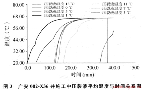 從圖3可見,階段1壓裂液90m3,從地表20℃升溫到65℃需要100min,即施工100min后階段1壓裂液才升溫到地層溫度,同樣階段3壓裂液在施工180min后才升溫到地層溫度,對(duì)于階段13來說,施工結(jié)束后,該段壓裂液的溫度才只有50℃。