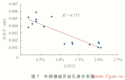 該區(qū)牛蹄塘組頁(yè)巖孔隙度為1.3%~25.6%,平均為8.24%,孔隙度中等;滲透率介于0.001~0.017mD,平均為0.008mD,滲透率極低。牛蹄塘組頁(yè)巖孔隙度與滲透率之間呈線性負(fù)相關(guān)關(guān)系,如圖7所示。