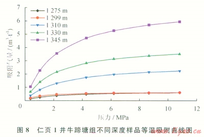 仁頁(yè)l井樣品等溫吸附實(shí)驗(yàn)共測(cè)定7個(gè)平衡壓力點(diǎn),每個(gè)壓力點(diǎn)達(dá)到平衡的時(shí)間約為12h,然后再增壓到下一個(gè)壓力點(diǎn),實(shí)驗(yàn)采用的甲烷氣濃度均大于99.999%。仁頁(yè)l井樣品等溫吸附曲線見(jiàn)圖8。