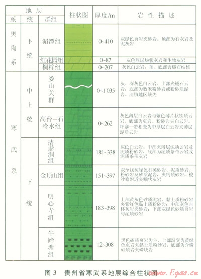 1)貴州省下寒武統(tǒng)牛蹄塘組主要分布于黔北、黔中及黔東 黔東南地區(qū),頁(yè)巖層段位于牛蹄塘組下部,巖性主要為含粉砂一粉砂質(zhì)、碳質(zhì)泥巖頁(yè)巖。