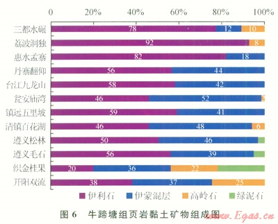 該區(qū)牛蹄塘組頁(yè)巖石英、長(zhǎng)石等碎屑礦物含量為24%~88%,平均為72.3%;自生脆性礦物含量為0~62%,平均為8.6%;黏土礦物含量介于l2%~30%,平均為19.0%。黏土礦物以伊利石和伊蒙混層為主,綠泥石較少見(jiàn)(圖6)。巖石礦物學(xué)特征表明:頁(yè)巖儲(chǔ)層脆性礦物總體含量高,具有較好的破裂潛力,預(yù)測(cè)開發(fā)過(guò)程中可取得較好的儲(chǔ)層改造效果[12]。
