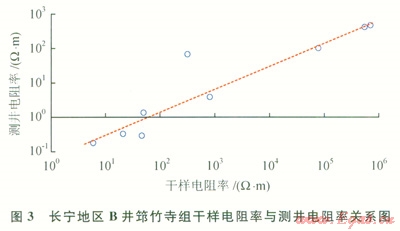 筆者將長寧B井筇竹寺組9個(gè)樣品點(diǎn)的井下測井電阻率與干樣電阻率進(jìn)行對比發(fā)現(xiàn),樣品點(diǎn)的測井電阻率為0.177~457.93W·m,較干樣電阻率整體低2~4個(gè)數(shù)量級(表1),但與后者具有顯著的正相關(guān)性,測井電阻率在2W·m以下則對應(yīng)的干樣電阻率小于100W·m(圖3)。另外,9個(gè)樣品點(diǎn)的測井電阻率與TOC同樣具有顯著的負(fù)相關(guān)性,在1860.96~1886.40m(富有機(jī)質(zhì)頁巖段)呈現(xiàn)超低電阻特征(電阻率介于0.177~1.347W·m)(表1)。這表明,長寧筇竹寺組井下導(dǎo)電物質(zhì)主要為有機(jī)質(zhì)和頁巖孔縫中地層水,其中擁有高礦化度的地層水是導(dǎo)致測井電阻率整體低于干樣電阻率的重要介質(zhì)。由于筇竹寺組下段為深水陸棚沉積,地層水物理化學(xué)性質(zhì)在整個(gè)層段總體穩(wěn)定,而有機(jī)質(zhì)豐度差異較大,僅在底部高伽馬段(192~615 API)較高,這表明長寧筇竹寺組底部出現(xiàn)的異常低電阻測井響應(yīng)則主要是碳化后的有機(jī)質(zhì)導(dǎo)電所致??梢姡脴O高成熟度、富有機(jī)質(zhì)頁巖的超低電阻測井響應(yīng)特征(電阻率小于2W·m)和干巖樣低電阻特征(電阻率小于100W·m),均可以直觀判斷有機(jī)質(zhì)的碳化程度,進(jìn)而評價(jià)烴源巖的質(zhì)量。
