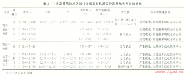 目前,與長寧B井具有相似電性特征的鉆井還有位于隆昌—瀘州、長寧—鎮(zhèn)雄—大方地區(qū)的G、B、H、1、J等5口井(表2、圖l),富有機(jī)質(zhì)頁巖測井電阻率介于0.1~2.0W·m,平均為0.5~0.8W·m,鉆探均未獲氣,均顯示有機(jī)質(zhì)出現(xiàn)嚴(yán)重碳化現(xiàn)象。