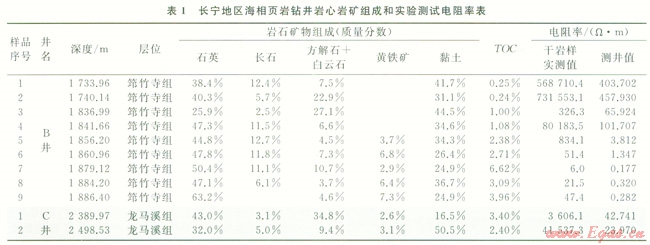 筆者以川南長寧地區(qū)筇竹寺組、龍馬溪組黑色頁巖為研究對象,在B井筇竹寺組、C井龍馬溪組分別挑選有機(jī)質(zhì)豐度不同的頁巖樣品開展干樣電阻率實(shí)驗(yàn)測試(前者9個(gè),后者2個(gè))。實(shí)驗(yàn)過程如下:首先對樣品進(jìn)行干燥處理,去除所有頁巖樣品的基質(zhì)孔隙殘留水,然后分別測量十樣電阻率、巖礦和TOC。實(shí)驗(yàn)測試結(jié)果顯示(表1、圖2),2套頁巖的干樣呈現(xiàn)出截然不同的電性特征。