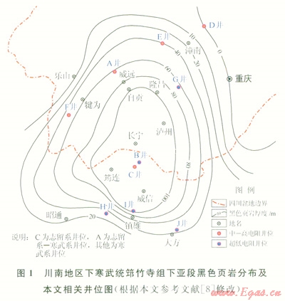 對筇竹寺組的勘探和研究程度遠(yuǎn)不及龍馬溪組,所鉆的頁巖氣評價(jià)井僅4口(編號A、B、H、I),主要分布在川滇的威遠(yuǎn)、長寧和鎮(zhèn)雄地區(qū),其他揭示寒武系頁巖的鉆井(編號D、E、F、G、J)皆為常規(guī)油氣勘探評價(jià)井(圖1)。鑒于烴源巖碳化呵能導(dǎo)致電測曲線出現(xiàn)低—超低電阻響應(yīng)特征,筆者以筇竹寺組頁巖鉆井巖心、測井和分析測試資料為基礎(chǔ),通過對富有機(jī)質(zhì)頁巖干樣開展電阻率實(shí)驗(yàn)測試以獲得有機(jī)質(zhì)碳化的直接證據(jù),并以此對井下電阻率測井?dāng)?shù)據(jù)進(jìn)行標(biāo)定,進(jìn)而利用測井電阻率響應(yīng)對川南不同地區(qū)筇竹寺組的有機(jī)質(zhì)碳化現(xiàn)象進(jìn)行表征;同時(shí)結(jié)合與龍馬溪組電性、巖相、地球化學(xué)、吸附能力等相關(guān)資料的對比分析,探討不同程度的有機(jī)質(zhì)碳化現(xiàn)象對頁巖氣賦存條件的影響,以探尋極高成熟度海相頁巖氣地質(zhì)評價(jià)的新途徑,并據(jù)此為筇竹寺組頁巖氣資源戰(zhàn)略選區(qū)提供地質(zhì)依據(jù)。