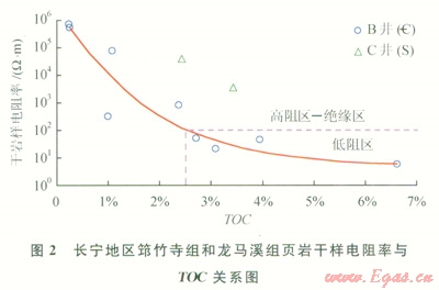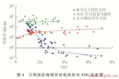 富有機(jī)質(zhì)頁巖為硅質(zhì)頁巖、碳質(zhì)頁巖和粉砂質(zhì)頁巖組合,與龍馬溪組在巖相、巖石礦物組成和有機(jī)質(zhì)豐度等方面相近[8,18,21],因此兩者的電性特征應(yīng)該具有可對比性,且能反映有機(jī)質(zhì)成熟度的差異。與龍馬溪組電性特征相比,B井測井響應(yīng)為低超低電阻特征(一般低于1W·m),電阻率與有機(jī)質(zhì)豐度關(guān)系呈明顯負(fù)相關(guān)性(出現(xiàn)反轉(zhuǎn)),即電阻率隨TOC增大而降低(圖4)。前面論述已證實(shí)其有機(jī)質(zhì)已出現(xiàn)嚴(yán)重碳化現(xiàn)象。根據(jù)鉆探和地球化學(xué)分析結(jié)果,B井筇竹寺組未獲氣顯示,頁巖殘余有機(jī)質(zhì)生烴潛量介于0.02~0.04mg/g,氫指數(shù)HI介于1~2mg/g。這表明,長寧筇竹寺組總體已處于生氣衰竭的極高成熟階段,生氣潛力較龍馬溪組差。