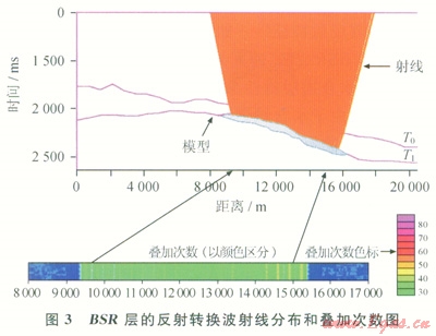 通過目標(biāo)體的二維地震剖面,按HF-OBS分布間距,通過射線追蹤模擬,分析縱、橫波接收情況,根據(jù)覆蓋次數(shù)與均勻程度,選取最佳的覆蓋效果(圖3)。圖中藍(lán)色表示水合物目標(biāo)體(剖面),射線所指的紅色區(qū)域表示所對應(yīng)的反射轉(zhuǎn)換波射線分布區(qū)域。通過對HF-OBS分布間距為100m、200m、300m、400m、500m、600m、700m和1000m等情況下模擬得到的幾組數(shù)據(jù)的分析比較,分別計算落入不同距離的線段內(nèi)的疊加次數(shù),并用色標(biāo)進(jìn)行表示,然后分析疊加次數(shù)的均勻程度和覆蓋效果。當(dāng)HF-OBS分布間距在500m以下時(300~400m效果最佳),線段內(nèi)的疊加次數(shù)達(dá)超過30次,并且疊加次數(shù)的分布比較均勻。最后,確定HF-OBS臺站間距小于500m時效果較好,且分布間距愈小,所使用的HF-OBS臺數(shù)愈多,疊加次數(shù)愈高,覆蓋效果愈好。