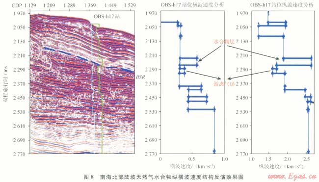 盡管橫波的整體成像效果尚無法與縱波相比,但其走時信息可用于縱橫波速度聯(lián)合反演以獲得HF-OBS所在位置較可靠的縱波和橫波速度,進(jìn)而進(jìn)行定量分析并確定水合物存在與否。圖8為HF-OBShl7站位的速度反演結(jié)果??v橫波速度在BSR上部明顯增大,縱波速度值介于1788~2742m/s,增幅為420~1090m/s;橫波速度介于400~600m/s,增幅為200~260m/s,反映水合物礦體的存在。淺部的縱波速度急劇下降而橫波幾乎沒有變化,表明此處存在淺部游離氣或游離氣運(yùn)移通道。從圖8可以看出,HF-OBS反演速度的垂向分辨率比傳統(tǒng)的速度譜分辨率有了很大的提高,充分揭示了天然氣水合物的縱、橫波速度結(jié)構(gòu),并且速度結(jié)構(gòu)異常與BSR及水合物礦體的分布層位有很好的對應(yīng)關(guān)系[18],從而增強(qiáng)了對水合物礦體的分辨能力。