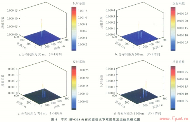 圖4為聚焦模擬效果圖。當(dāng)HF-OBS分布間距為500m時,出現(xiàn)明顯旁瓣,但模擬震源的位置并未發(fā)牛變化(圖4-b);當(dāng)分布間距為750m時,模擬震源的位置發(fā)生變化,成像效果明顯變差(圖4-c);當(dāng)分布間距變小時,模擬成像效果愈來愈好(圖4-a)。