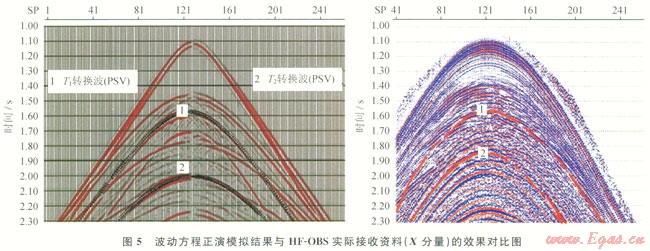 以南海北部陸坡地震測線A所對應(yīng)的二維地震剖面作為波動正演模型的基礎(chǔ),炮點(diǎn)位于模型中間的海面上,在海上和海底同時接收。圖5為波動方程正演模擬的結(jié)果與HF-OBS實(shí)際接收資料的效果對比圖。正演模擬結(jié)果可以幫助分析野外HF-OBS數(shù)據(jù)的接收效果,對野外采集具有較好的指導(dǎo)作用。