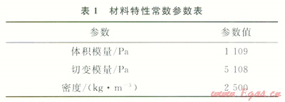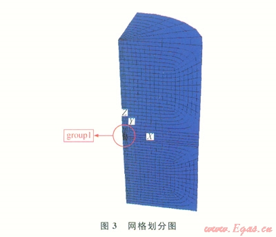 圖3中,1/4圓柱體模擬儲氣庫溶腔周圍的地質環(huán)境,其直徑是儲氣庫溶腔模型最大直徑的20倍,在網(wǎng)格中間位置可以看到儲氣庫溶腔輪廓的1/4。在網(wǎng)格劃分時將儲氣庫溶腔網(wǎng)格一起劃分,有助于儲氣庫溶腔的形成。在此網(wǎng)格中,定義了2個組,分別是group1和group2,前者對儲氣庫溶腔進行網(wǎng)格劃分,后者對儲氣庫溶腔周圍地質環(huán)境進行網(wǎng)格劃分。選擇采用各向同性彈性模型,其材料特性常數(shù)見表1。