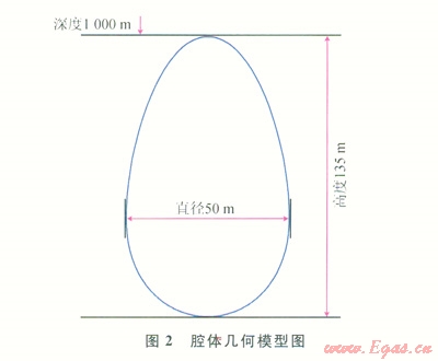 我國鹽巖礦藏以多夾層鹽巖為主,由于主要分析鹽穴儲氣庫溶腔在鹽巖蠕變下的變形規(guī)律,因此在建立儲氣庫溶腔模型時將復雜的鹽巖夾層簡化為簡單的單層鹽巖層。借鑒江蘇金壇鹽穴儲氣庫的建庫參數(shù)[4],建立了如圖2所示的腔體幾何模型。建立溶腔及圍巖地層模型后,將地層巖石力學參數(shù)、鹽層的蠕變關系、溶腔周圍的地應力參數(shù)及溶腔運行參數(shù)帶入模型中進行模擬計算。