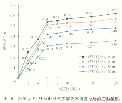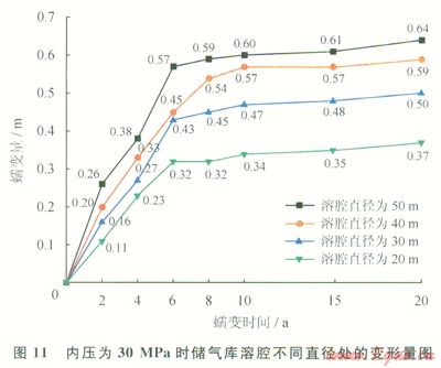 對比分析圖9~11,可以得出:①溶腔不同直徑處變形量隨時間變化規(guī)律比較一致,溶腔直徑為50m處的變形量最大;②蠕變時間為6a時,不同壓力下溶腔不同直徑處變形量曲線均出現(xiàn)一個明顯的轉折點。蠕變時間小于6a時,溶腔變形量曲線斜率較大,表明在此時間內(nèi)溶腔變形速率較大,變形比較顯著;蠕變時間大于6a時,溶腔變形量曲線較平緩,溶腔變形量隨時間變化不大;③內(nèi)壓為10MPa時,蠕變20a后,溶腔直徑為50m處變形量為360mm。內(nèi)壓為20MPa時,蠕變20a后,溶腔直徑為50m處變形量為620mm。內(nèi)壓為30MPa時,蠕變20a后,溶腔直徑為50m處變形量為640mm。數(shù)據(jù)表明,溶腔內(nèi)壓小于20MPa時,溶腔變形量隨壓力增大顯著增加;溶腔內(nèi)壓大于20MPa時,溶腔變形量變化不大。