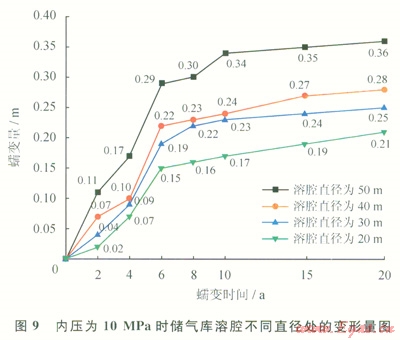 根據(jù)模擬計算所得結果,可以得到不同壓力下儲氣庫溶腔不同直徑處變形量圖(圖9~11),經(jīng)總結分析,僅列出具有代表性的分析圖。圖9~11分別表示溶腔內(nèi)壓為10MPa、20MPa、30MPa時,不同蠕變時間鹽穴儲氣庫溶腔不同直徑處的變形量。
