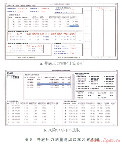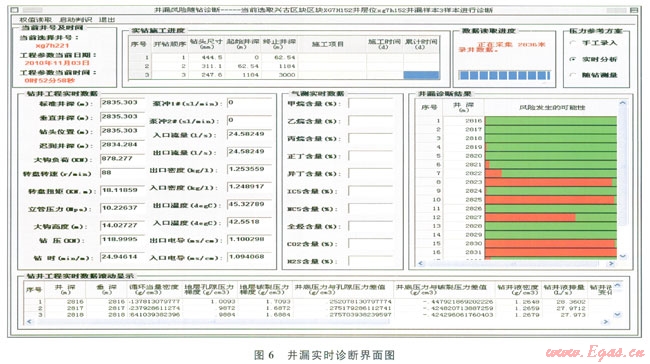在我國某油田鉆井時(shí),應(yīng)用鉆井風(fēng)險(xiǎn)控制系統(tǒng)實(shí)時(shí)診斷鉆井狀態(tài),分別對鉆井實(shí)時(shí)數(shù)據(jù)采集軟件、鉆井實(shí)時(shí)數(shù)據(jù)庫管理軟件、鉆井風(fēng)險(xiǎn)因素實(shí)時(shí)計(jì)算分析軟件和鉆井風(fēng)險(xiǎn)推理風(fēng)險(xiǎn)軟件進(jìn)行現(xiàn)場測試(圖5、6)。以采集的鉆井實(shí)時(shí)數(shù)據(jù)為基礎(chǔ),應(yīng)用鉆井風(fēng)險(xiǎn)因素實(shí)時(shí)分析軟件計(jì)算井底壓力和地層壓力等參數(shù),以鄰井資料作為井漏風(fēng)險(xiǎn)學(xué)習(xí)的樣本,判斷該井井漏風(fēng)險(xiǎn),系統(tǒng)判斷該井在鉆至2823m時(shí)井漏風(fēng)險(xiǎn)可能性較大,當(dāng)鉆進(jìn)至2825m時(shí)技術(shù)人員發(fā)現(xiàn)井底發(fā)生漏失,決定進(jìn)行起鉆堵漏作業(yè)?,F(xiàn)場測試表明鉆井風(fēng)險(xiǎn)控制系統(tǒng)的數(shù)據(jù)采集軟件與儀器測量儀器同步性好,數(shù)據(jù)庫設(shè)計(jì)合理,且井漏風(fēng)險(xiǎn)實(shí)時(shí)診斷預(yù)測結(jié)果與現(xiàn)場完全吻合。