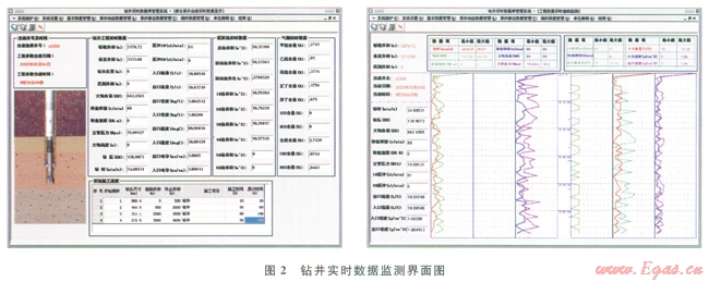 3)建立了以國際通用WITS標(biāo)準(zhǔn)為參考依據(jù)的鉆井風(fēng)險(xiǎn)控制系統(tǒng)數(shù)據(jù)庫,并優(yōu)化了數(shù)據(jù)庫結(jié)構(gòu)及查詢模式,開發(fā)了鉆井風(fēng)險(xiǎn)控制系統(tǒng)實(shí)時(shí)數(shù)據(jù)庫管理軟件。軟件為用戶提供了數(shù)據(jù)庫備份、數(shù)據(jù)庫還原功能;可以瀏覽、修改、查詢、導(dǎo)出、導(dǎo)入、刪除、整理任意井的鉆井?dāng)?shù)據(jù);可以對各種數(shù)據(jù)進(jìn)行實(shí)時(shí)顯示、按時(shí)間回放、按井深回放;可以將任意數(shù)據(jù)導(dǎo)出到文本文件中;可以進(jìn)行異地備份;可以按用戶需要導(dǎo)入相關(guān)數(shù)據(jù),鉆井實(shí)時(shí)數(shù)據(jù)監(jiān)測界面如圖2所示。