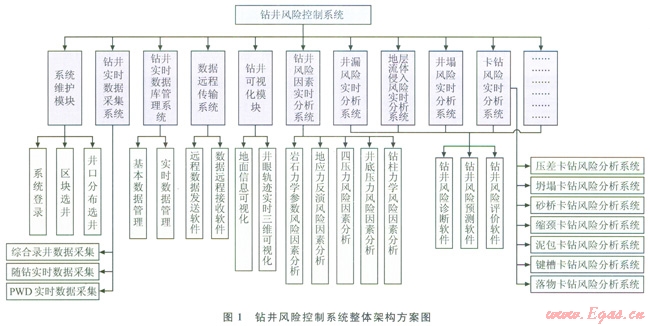 通過調(diào)研國內(nèi)外研究現(xiàn)狀,結(jié)合國內(nèi)生產(chǎn)需要,提出了一套鉆井風(fēng)險(xiǎn)控制系統(tǒng)的整體架構(gòu)方案,如圖1所示。系統(tǒng)主要包括系統(tǒng)維護(hù)模塊、實(shí)時(shí)數(shù)據(jù)采集子系統(tǒng)、實(shí)時(shí)數(shù)據(jù)庫管理子系統(tǒng)、實(shí)時(shí)數(shù)據(jù)遠(yuǎn)程傳輸子系統(tǒng)、鉆井可視化模塊、鉆井風(fēng)險(xiǎn)因素實(shí)時(shí)分析子系統(tǒng)、不同井下復(fù)雜類型實(shí)時(shí)分析子系統(tǒng)等。實(shí)時(shí)數(shù)據(jù)采集子系統(tǒng)在井場采集錄井儀和隨鉆工具等儀器測量的鉆井實(shí)時(shí)參數(shù),并存儲到數(shù)據(jù)庫中,供鉆井風(fēng)險(xiǎn)控制軟件系統(tǒng)調(diào)用、瀏覽、分析各項(xiàng)參數(shù)變化,并診斷、預(yù)測各種井下復(fù)雜情況,達(dá)到鉆井風(fēng)險(xiǎn)控制的目的。鉆井風(fēng)險(xiǎn)控制系統(tǒng)預(yù)期應(yīng)實(shí)現(xiàn)的功能包括: