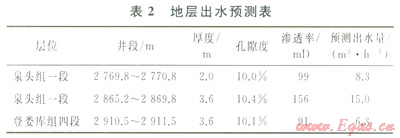 鉆至2900m(2870m進入登婁庫組四段),扭矩開始發(fā)牛波動,預(yù)計鉆達第3個水層(表2)。2914m接立柱后恢復(fù)鉆進時返出氣體潮濕,判斷接換立柱時井下已經(jīng)出水。循環(huán)30min后粉塵返出,現(xiàn)場繼續(xù)采用氣體鉆井,鉆時3~15min/m。