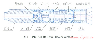和空氣錘[1]類似,研制的泡沫錘采用無閥式中心排氣結(jié)構(gòu),并增加了防倒灌裝置。主要構(gòu)成部件有:后接頭、外套筒、逆止閥、配氣座、活塞、活塞缸、尾管、防倒灌裝置、鉆頭(圖1)。