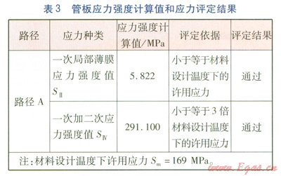 對于薄壁結(jié)構(gòu),JB 4732—1995《鋼制壓力容器——分析設(shè)計標(biāo)準(zhǔn)》(2005年確認(rèn))第5.3節(jié)給出了應(yīng)力強(qiáng)度的評定依據(jù):一次局部薄膜應(yīng)力強(qiáng)度值SⅡ小于等于1.5Sm;一次加二次應(yīng)力強(qiáng)度值SⅣ小于等于3Sm。對U形換熱管不存在管子對管板的彈性基礎(chǔ)作用,從管板系統(tǒng)安全裕度出發(fā),本工程SⅡ取小于等于1.0Sm。按照上述評判依據(jù),對計算應(yīng)力值與材料許用應(yīng)力值進(jìn)行比較,從而完成應(yīng)力評定,確定結(jié)構(gòu)承壓條件下的安全性[3]。應(yīng)力評定結(jié)果見表3。