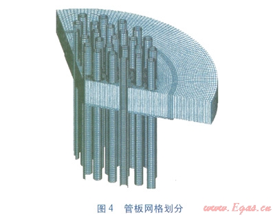 本例使用ANSYS軟件按表1尺寸建立有限元模型??紤]到管孔的對稱性,可建立l/3等效模型,見圖3。初步取管板厚度dn=68mm,其余結(jié)構(gòu)尺寸按表1選取。因換熱管采用焊接方式連接在管板上,建模時可以認(rèn)為換熱管與管板已達(dá)到一體化程度,單元是相互連接的,不存在接觸問題。應(yīng)力邊緣效應(yīng)的影響長度公式為[2]: