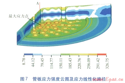 應(yīng)力線性化是ANSYS軟件對運算結(jié)果進(jìn)行后處理以讀取計算數(shù)據(jù)的方法。應(yīng)力線性化路徑的選取原則是:通過應(yīng)力強(qiáng)度最大位置處的節(jié)點,并以最短距離橫穿構(gòu)件壁的方向設(shè)定應(yīng)力線性化路徑[4]。軟件系統(tǒng)則在路徑上通過內(nèi)插法自動生成插值點,并把計算結(jié)果映射到路徑上。軟件會自動對計算結(jié)果進(jìn)行應(yīng)力分類,并顯示相應(yīng)路徑下的各類計算應(yīng)力值?;诒?span lang="EN-US">2強(qiáng)度計算所需載荷數(shù)據(jù),通過軟件計算,得到管板應(yīng)力強(qiáng)度分布及應(yīng)力線性化路徑,見圖6、7,圖中數(shù)值為應(yīng)力強(qiáng)度,單位為MPa。
