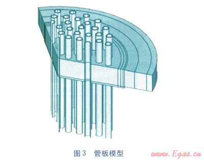 因此,建模時在理論上換熱管在管板兩側(cè)需要保留的外伸長度應(yīng)大于9.7mm,即可滿足要求。根據(jù)工程實際情況,該模型取換熱管相對于管板向上外伸長度為140mm,向下外伸長度為300mm(實際加熱器換熱管相對于管板向上外伸長度為160mm,向下外伸長度為2400mm)。