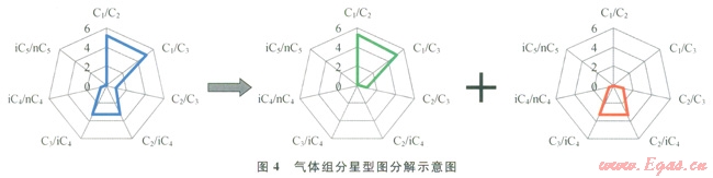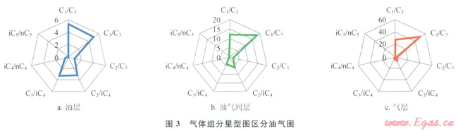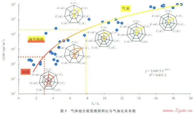 2)氣體組分星型圖面積sa與輕質(zhì)組分含量有關(guān),面積Sb與重質(zhì)組分含量有關(guān),其面積比Sa/Sb與氣油比有很好的對(duì)應(yīng)關(guān)系,面積比Sa/Sb越大,氣油比越高。