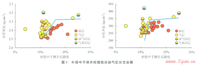 補(bǔ)償中子挖掘效應(yīng)方法認(rèn)為氣層補(bǔ)償中子孔隙度會(huì)降低,而聲波和密度視孔隙度會(huì)增高,因此氣層的補(bǔ)償中子孔隙度與聲波或密度視孔隙度之間會(huì)存在一定差異。然而不同氣層的地層壓力、含氫指數(shù)、密度等是有差別的[7];同時(shí),泥質(zhì)含量的高低、儲(chǔ)層巖屑成分含量的變化等因素都會(huì)影響三孔隙度曲線,從而在一定程度上掩蓋氣的響應(yīng);另外砂泥巖地層中頻繁出現(xiàn)的擴(kuò)徑現(xiàn)象也會(huì)導(dǎo)致三孔隙度曲線質(zhì)量降低。圖1為補(bǔ)償測(cè)井挖掘效應(yīng)油氣區(qū)分交會(huì)圖,在井徑規(guī)則,三孔隙度曲線質(zhì)量合格的井段,有一定效果,但無(wú)法區(qū)分油氣同層。