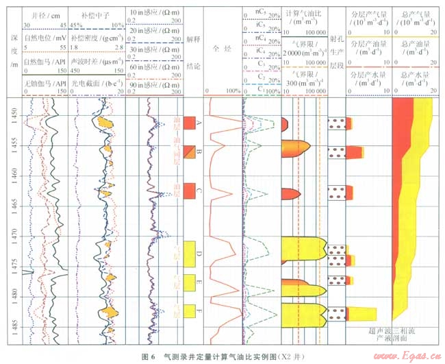 圖6為英東油氣田X2井氣測(cè)錄井定量計(jì)算氣油比的實(shí)例。井深1450~1485m,常規(guī)測(cè)井“挖掘效應(yīng)”區(qū)分油氣效果較差,無(wú)論油層還是氣層密度—中子的“鏡像特征”相差不大。該井投產(chǎn)時(shí),A—F這6個(gè)層一起射開(kāi),5mm油嘴自噴,平均日產(chǎn)油9.74m3、氣9602m3、水0.13m3。氣測(cè)錄井氣體組分星型圖判別A、B、C為油層油氣層,其氣油比分別約為36m3/m3、2000m3/m3、180m3/m3;D、E、F為氣層,其氣油比分別約為48000m3/m3、27000m3/m3、37000m3/m3;計(jì)算結(jié)果與超聲波三相流產(chǎn)液剖面基本一致。