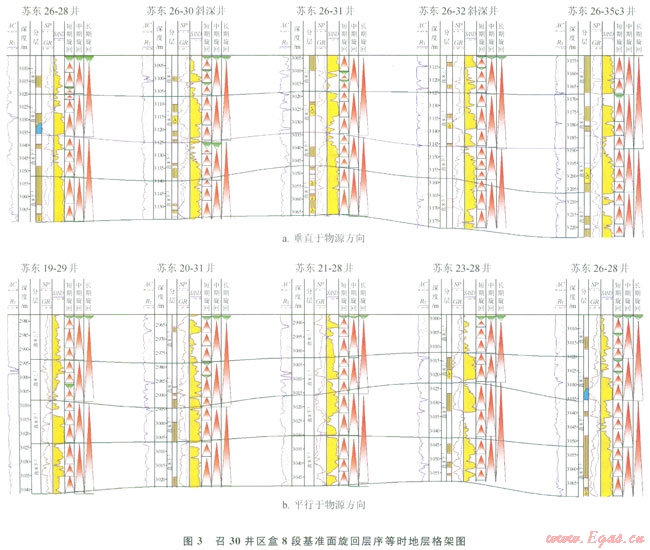 蘇里格地區(qū)盒8段砂體構型可分為復合河道砂體和單一河道砂體,前者被稱為疊置河道砂,后者被稱為單河道砂。本文以層序地層學理論為依據,在層序地層界面識別的基礎上,建立了召30井區(qū)盒8段高分辨率層序地層格架,通過中期基準面的對比識別出疊置河道砂,進而通過短期基準面的對比識別出單河道砂,并定量刻畫該地區(qū)盒8段河道帶及河道砂體規(guī)模,建立儲集砂體構型,以期為氣田開發(fā)過程中的井距優(yōu)化和天然氣“甜點”的選擇提供依據,提高氣田開發(fā)效益。