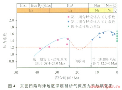 利津地區(qū)凝析氣藏古壓力系數(shù)隨時(shí)間演化的關(guān)系表明(4)