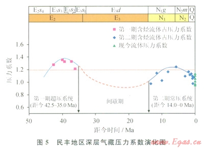 民豐地區(qū)深層氣藏(包括凝析氣藏)古壓力系數(shù)隨時(shí)間演化的關(guān)系表明(5)