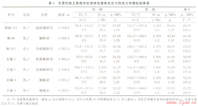 將各期次鹽水包裹體的均一溫度及其共生的同期含烴鹽水包裹體或烴類包裹體的均一溫度、氣/液比和化學(xué)組成輸入VTFLINC軟件,即可獲得熱動(dòng)力學(xué)模擬結(jié)果——各期次流體包裹體的最小捕獲壓力和壓力系數(shù)。利用東營(yíng)凹陷北帶利津、民豐等地區(qū)所采集樣品獲得“數(shù)據(jù)對(duì)”的樣品開(kāi)展了熱動(dòng)力學(xué)模擬,模擬得到了主要探井的部分古流體壓力(1)