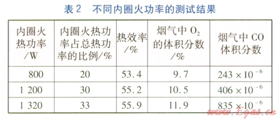 在燃燒器直徑一定的情況下,適當(dāng)增大內(nèi)圈火熱功率也可實(shí)現(xiàn)熱效率的提升。以我公司某款不帶二次空氣獨(dú)立流動通道的嵌入式燃?xì)庠顬槔?,燃燒器熱功率?span lang="EN-US">4.0kW,內(nèi)圈火熱功率所占比例為20%,即0.8kW。在試驗過程中,不斷增大內(nèi)圈火熱功率所占的比例,由20%逐步提高至30%,其熱效率逐漸增高。但增大到一定比例時,其煙氣中CO含量翻倍增長,熱效率增加減緩。不同內(nèi)圈火熱功率的測試結(jié)果見表2,具體數(shù)值變化情況與燃燒器結(jié)構(gòu)設(shè)計有直接關(guān)系,因此內(nèi)圈火熱功率應(yīng)針對具體的燃?xì)庠钸M(jìn)行試驗確定。