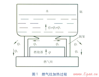家用燃?xì)庠顭嵝适窃跇?biāo)準(zhǔn)試驗條件下,有效利用的熱量在燃?xì)馊紵尫趴偀崃恐兴嫉谋壤?,即燃?xì)饽茉吹睦寐?,是衡量家用燃?xì)庠钍欠窆?jié)能的關(guān)鍵指標(biāo)。我們以GB16410—2007《家用燃?xì)庠罹摺芬?guī)定的標(biāo)準(zhǔn)試驗條件下的燃?xì)庠詈驮囼炗缅佔(zhàn)鳛檠芯繉ο?,分析燃?xì)庠畹募訜徇^程(見圖1)。